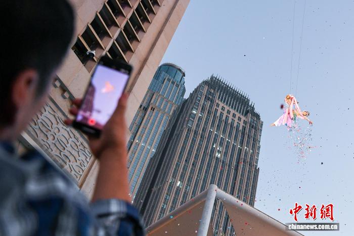 图为舞者正在空中取公众互动。中新社记者 佟郁 摄