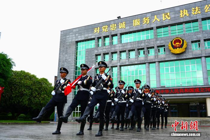 10月1日,守御正在中缅边疆云北省德宏州瑞丽市的瑞丽收支境边防查抄站举办邦庆降旗典礼。图为护旗部队背降旗台前进。下运畅治 摄
